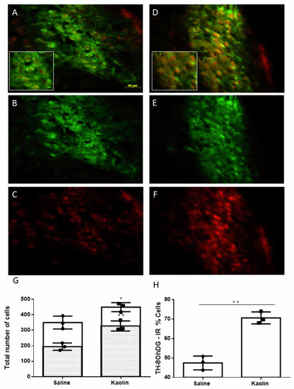 Co-localization of TH and 8-OHdG in the LC. Representative immunofluorescence photomicrographs from a saline-injected animal (A–C) and kaolin-injected animals (D–F) of the same section double-labelled for 8-OHdG and TH (A) or observed in a single channel for TH (B,E) or 8-OHdG (C,F). The inset in (A,D) shows the detail of neurons double-immunolabeled for TH (green) and 8-OHdG (red). Graph G shows the total numbers of 8-OHdG-IR neurons (white bars) or double-labelled for 8-OHdG and TH (grey bars). Graph H shows the percentage of TH-IR neurons that were also immunoreactive for 8-OHdG. Kaolin-injected animals presented an increase in the expression of 8-OHdG and co-localization of 8-OHdG in TH-IR neurons in the LC. Saline: n = 3; Kaolin: n = 3. Data in (G,H) are presented as means ±SEM.* p < 0.05; ** p < 0.01.