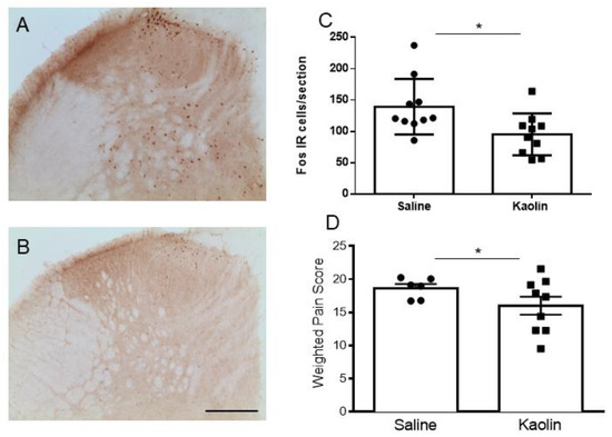 The evaluation of formalin-induced Fos expression in the spinal dorsal horn (Figure 5A–C) showed a decrease in the numbers of Fos-IR cells in kaolin-injected animals (p < 0.05; Figure 5C). The subcutaneous injection of formalin produced a typical biphasic response consisting of increases in licking and biting of the injected paw and flinching of the paw and hindquarters. The first phase was short (about 10 min) and recruited mainly peripheral mechanisms, and the second phase lasted longer and sustained and recruited supraspinal mechanisms [35]. Between the two phases, a quiescent period occurred. Kaolin-injected animals presented a decrease in painful behaviors during the second phase of formalin test (p < 0.05; Figure 5D). No differences were detected in the first phase or quiescent phases of the formalin test (Figure A3).