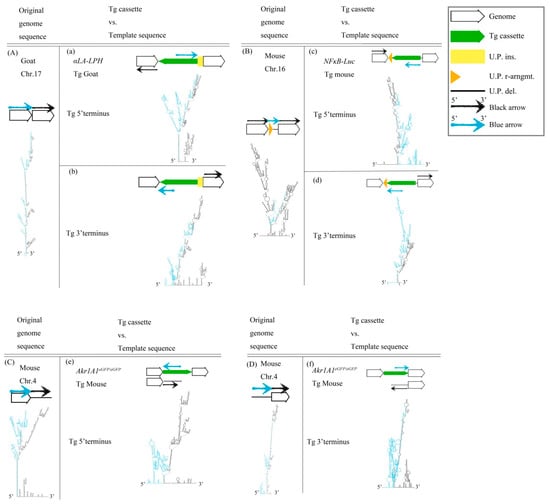 DNA structure of the Tg animal genome before and after Tg integration. (A) Goat chr.17 locus, (B) Mouse chr.16 locus, (C) 5′ terminus, and (D) 3′ terminus of mouse chr.4. (a–f) Descriptions of predicted secondary structures of fusion sequences from the Tg cassette and the predetermined template allele. These secondary structures show the situation of the two sequence assemblies. All sequences are provided in Table S1. Tg cassette, transgene cassette; U.P. ins., unpredictable insertion; U.P. del., unpredictable deletion; U.P. r-arngmt., unpredictable rearrangement. Blue arrow, blue sequences in secondary structures. Black arrow, black sequences in secondary structures.