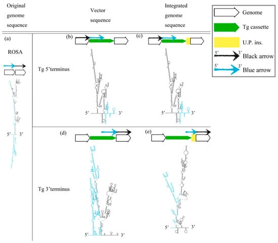 Prediction of the secondary structure of knock-in Tg in the ROSA locus. (a) The secondary structure of the mouse ROSA26 locus. (b) The 5′ terminal secondary structures of the pDonor-αLA-Ap1x6-mROSA plasmid and (d) the 3′ terminal secondary structures. Secondary structures of the genome sequence without U.P. ins. (c) and with U.P. ins. (e) from ICR-Gt(ROSA)26Sorem(αLA-Ap1x6)BM2/M. All sequences are provided in Table S1. Tg cassette, transgene cassette; U.P. ins., unpredictable insertion. Blue arrow, blue sequences in secondary structures. Black arrow, black sequences in secondary structures.