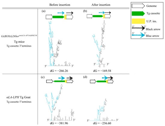 DsDNA stability improved after insertion. (a,c) Predictions of secondary structures and dG values of the mouse ROSA26 locus and αLA-LPH goat Tg locus without the insertion. (b,d) Predictions of secondary structures and dG values of the mouse ROSA26 locus and αLA-LPH goat Tg locus with the insertion. All sequences are provided in Table S1. Tg cassette, transgene cassette; U.P. Ins., unpredictable insertion. Blue arrow, blue sequences in secondary structures. Black arrow, black sequences in secondary structures. dG, Gibbs free energy.