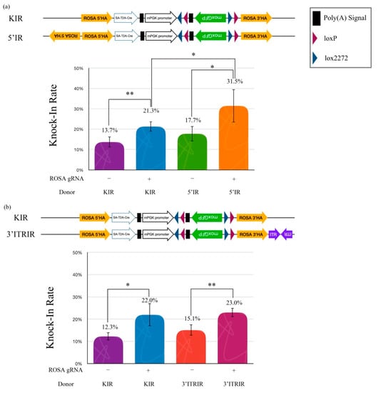 We wanted to explain whether the cruciform DNA structure is a legible template for HR. Therefore, three artificial inverted repeat (IR) HA donor plasmids, including a standard knock-in reporter (KIR), a 5′-inverted repeat knock-in reporter (5′IR), and a 3′-extra inverted terminal repeat (ITR)/inverted repeat knock-in reporter (3′ITRIR), were designed to elucidate whether the cruciform DNA actually improved the legibility of HR efficiency in NIH/3T3 cells (Figure 4a). Our hypothesis was that the artificial inverted repeat HA in the donor plasmid would accelerate HR efficiency when a double-strand break (DSB) was created by the CRISPR/Cas9 machinery. The data showed that the KI efficiency of the 5′IR donor with ROSA gRNA (31.5%) was significantly higher than that with the KIR donor (21.3%) (p < 0.05). However, the KI efficiency of the 5′IR donor without the ROSA gRNA group was not different from the KIR without the ROSA gRNA group (17.7% vs. 13.7%) (Figure 4a). These results suggest that the 5′ inverted repeat HA improves the HR efficiency in cells. The improvement of KI efficiency only occurred after DSB induction using gene-editing tools.