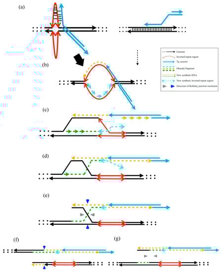 According to our findings, we proposed a putative model for exogenous DNA insertion cross-reacting via the stem-loop structure of host genomes. The instability of the template DNA with several inverted repeat cruciform DNA structures improves recombination enzyme recognition. The template DNA was easily integrated via the 3′-overhang of linear exogenous DNAs (Figure 5a–c). The linear DNAs were linked with gDNA via asymmetric Holliday junction resolution (Figure 5d–g). The HR or other repair mechanisms may insert unpredicted sequences into junctions of Tg cassettes and host genomes []. The addition of dG values after unpredicted insertion may provide the evidence that the gDNA stability was related to the unpredicted modification.