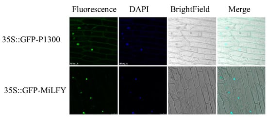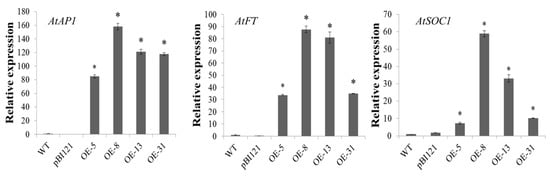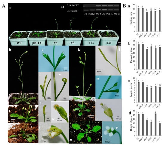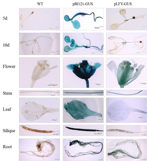 2.5. Activity of GUS Driven by the MiLFY Promoter in Transgenic Arabidopsis Lines