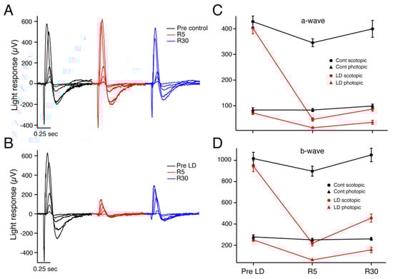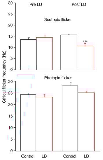 - Rubin, G.R.; Wen, Y.; Loop, M.S.; Kraft, T.W. ERG and Behavioral CFF in Light-Damaged Albino Rats. Int. J. Mol. Sci. 2022; in press. [Google Scholar]