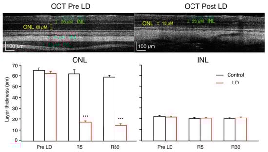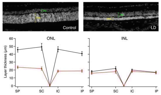 - Montalbán-Soler, L.; Alarcón-Martínez, L.; Jiménez-López, M.; Salinas-Navarro, M.; Galindo-Romero, C.; Bezerra de Sá, F.; García-Ayuso, D.; Avilés-Trigueros, M.; Vidal-Sanz, M.; Agudo-Barriuso, M.; et al. Retinal compensatory changes after light damage in albino mice. Mol. Vis. 2012, 18, 675–693. [Google Scholar]