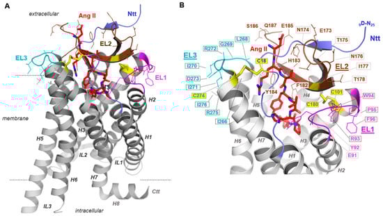 - Unal, H.; Jagannathan, R.; Bhatnagar, A.; Tirupula, K.; Desnoyer, R.; Karnik, S.S. Long range effect of mutations on specific conformational changes in the extracellular loop 2 of angiotensin II type 1 receptor. J. Biol. Chem. 2013, 288, 540–551. [Google Scholar] [CrossRef] [PubMed]