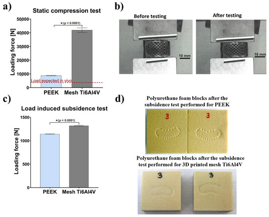 Mechanical behavior of tested intervertebral cages: (a) Results obtained with a static compression test in relation to the in vivo expected load (* statistically different results compared to PEEK cage according to unpaired t-test); (b) Images presenting Ti6Al4V intervertebral cage before and after static compression testing; (c) Results obtained with a load-induced subsidence test (* statistically different results compared to PEEK cage according to unpaired t-test; (d) Images presenting the appearance of the polyurethane foam blocks after the subsidence test performed for PEEK cage and 3D-printed mesh Ti6Al4V cage.