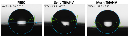 The wettability test we performed confirmed the hydrophobic character of PEEK, since the water contact angle (WCA) was equal to 94.5°. Surprisingly, solid titanium samples showed similar WCA to PEEK, whereas introduction of mesh porosity significantly increased WCA to 117.7° (Figure 3). Although mesh and solid Ti6Al4V samples had the same chemical composition, the applied printing conditions might have affected topography of the resultant samples, and thus their wettability. For instance, during the printing process the mesh sample was exposed to laser for a longer period of time. Moreover, surface of the mesh Ti6Al4V material was characterized by the presence of a greater amount of unmelted titanium particles, that could have hindered spreading of the water droplets during the test.