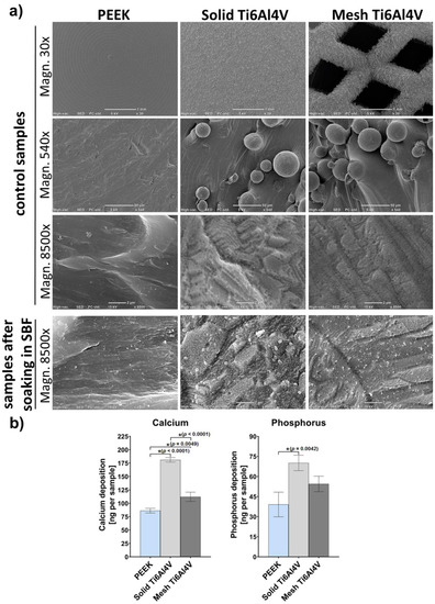 Scanning electron microscope (SEM) micrographs of untreated control samples (without incubation in SBF) clearly showed high surface roughness of both 3D-printed Ti6Al4V samples (solid and mesh) (Figure 4a). In contrast, the PEEK sample exhibited a rather smooth surface. The only roughness observed on the PEEK disc resulted from its production process, and primarily consisted of parallel longitudinal grooves and ridges. Immersion of the samples in SBF clearly demonstrated that the solid Ti6Al4V sample showed the highest bioactivity (apatite-forming ability) among all tested materials. Solid titanium was covered by many precipitates of calcium phosphates, whereas PEEK exhibited the lowest apatite-forming ability. SEM observation was confirmed by quantitative analysis of calcium and phosphorous deposition on the surface of the samples (Figure 4b), which clearly showed the greatest amount on the solid Ti6Al4V, compared to mesh titanium and PEEK. Observed poor bioactivity of PEEK is consistent with the results obtained by other authors and most likely is due to its smooth surface. Reduced bioactivity of the mesh sample may be explained by its higher hydrophobicity, compared to the solid titanium material.