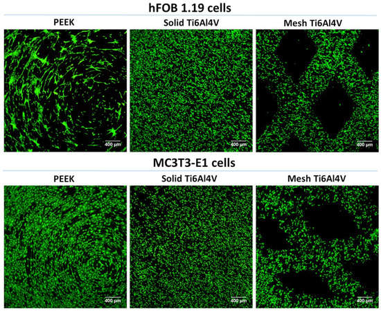 Within this study, osteoblast viability, adhesion, and growth on the tested implants were assessed using two in vitro cellular models: (1) human fetal osteoblasts (hFOB 1.19 cell line) and (2) mouse calvarial preosteoblasts (MC3T3-E1 Subclone 4 cell line). We performed live/dead staining of the cells cultured on the samples, which showed that all materials were non-toxic and favored cell adhesion (Figure 5). The cells were viable and emitted only green fluorescence. No dead cells (red fluorescence) were detected. Interestingly, confocal laser scanning microscope (CLSM) images revealed that human osteoblasts (hFOB 1.19) cultured on the PEEK sample had a tendency to form clusters. Moreover, noticeably fewer hFOB 1.19 cells were observed on PEEK. In the case of MC3T3-E1 preosteoblasts, there were no differences in osteoblast growth between tested samples.