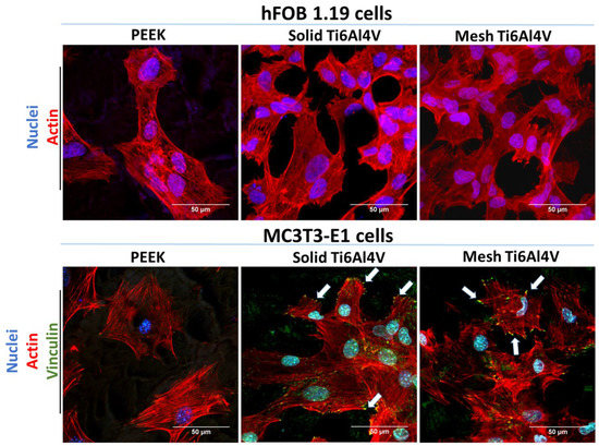 Analysis of cell morphology after fluorescent staining of the cytoskeleton confirmed inferior adhesion of human osteoblasts to PEEK, since high magnification CLSM images revealed better spreading of hFOB 1.19 cells on both Ti6Al4V samples, compared to the non-metallic sample (Figure 6). In the case of MC3T3-E1 preosteoblasts, the cells showed similar spreading and morphology on all tested materials. However, cells on PEEK were vinculin-negative and did not form focal adhesion plaques (FAPs). Vinculin is a protein involved in the linking of integrin to F-actin, forming FAPs that provide mechanical linkages to extracellular matrix (ECM) as well as implant surface covered by adsorbed proteins [40,41]. Unlike cells on PEEK, MC3T3-E1 preosteoblasts grown on both 3D-printed Ti6Al4V materials formed typical FAPs, proving their strong adhesion to the titanium samples.