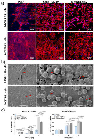 Better growth and proliferation of hFOB 1.19 osteoblasts on the surface of both Ti6Al4V materials, compared to PEEK, was also proven by visualization of the samples after 4-day culture using CLSM and SEM. There were noticeably fewer hFOB 1.19 cells on the surface of PEEK compared to both titanium materials (Figure 7a,b). Moreover, quantitative evaluation of cell proliferation revealed that there were 4-fold and 3-fold more hFOB 1.19 cells on the surface of solid Ti6Al4V and mesh Ti6Al4V samples, respectively, compared to PEEK (Figure 7c). Interestingly, on the second and fourth day of the culture a significantly greater number of cells was detected on the surface of the solid Ti6Al4V material, compared to the mesh one; indicating that the solid titanium sample was more favorable to proliferation of human osteoblasts. Unlike hFOB 1.19 cells, CLSM and SEM images showed similar growth of MC3T3-E1 preosteoblasts on all tested materials (Figure 7a,b). However, a quantitative assay clearly demonstrated that MC3T3-E1 cells revealed better proliferation on both Ti6Al4V samples, compared to PEEK (Figure 7c).