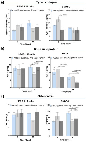 The hFOB 1.19 and BMDSC cells were seeded directly on the materials placed in the wells of 48-multiwell plates in 500 mL of growth medium at a concentration of 5 × 104 cells per sample and cultured at 37 °C. After 24-h culture, the growth medium was exchanged for osteogenic medium, containing 10 mM β-glycerophosphate, 50 μg/mL ascorbic acid, and 10−7 M dexamethasone (Sigma-Aldrich Chemicals, Warsaw, Poland). The cells were maintained in the osteogenic medium for 21 days. Every 3rd day, half of the osteogenic medium was replaced with a fresh portion. On the 7th and 14th day of the experiment, osteogenic markers (type I collagen—Col I, bone sialoprotein—BSP, osteocalcin—OC) were determined in cell lysates using appropriate ELISA kits (EIAab ELISA kit, Wuhan, China). The cell lysates were prepared by two freeze–thaw cycles and then underwent sonication at 30% amplitude for 30 s, as described earlier [43]. ELISA results were normalized to the total cellular proteins assessed by the BCA Protein Assay Kit (ThermoFisher Scientific, Waltham, Massachusetts, USA), and expressed as ng of the osteogenic marker per mg of total cellular proteins.