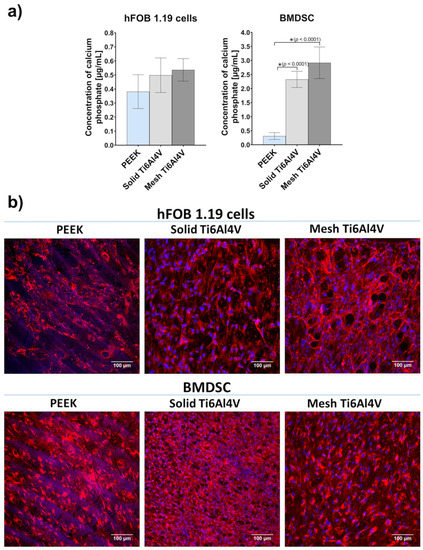 The quantitative ARS test showed 4-fold and 7-fold greater (compared to PEEK) mineralization of BMDSCs cultured on the solid Ti6Al4V and mesh Ti6Al4V materials, respectively (Figure 9a). Importantly, stem cells grown on mesh titanium also showed significantly greater mineral deposition, compared to the solid material. Thus, reduced level of BSP for the mesh Ti6Al4V sample, compared to the solid one, may also be explained by significantly enhanced mineralization of stem cells. Although human osteoblasts cultured on the Ti6Al4V materials showed higher levels of mineral compared to PEEK, the results were not statistically significant. It should be noted that ECM calcification highly depends on collagen deposition in the bone ECM, since apatite crystals are formed along the collagen fibers, serving as a framework for mineral deposition [42,44]. Immunofluorescent staining of Col I confirmed the presence of great amounts of this protein on all tested samples seeded with both osteoblasts and stem cells (Figure 9b).
