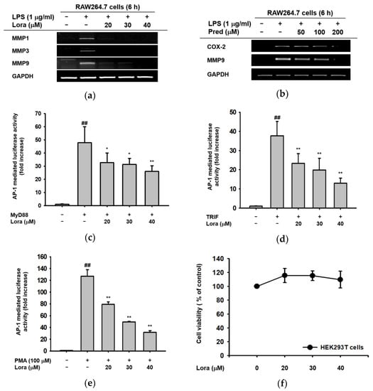 Inhibitory effects of Loratadine on the mRNA expression of pro-inflammatory genes and the transcriptional activation of inflammatory transcription factors. (a,b) RAW264.7 cells were pre-treated with the indicated concentrations of Loratadine (20–40 μM) or prednisolone (50–200 μM) for 30 min. The cells were treated with LPS (1 μg/mL) for 6 h, and the mRNA expression levels of MMP1, MMP3, MMP9, and GAPDH (control) were measured by reverse-transcription polymerase chain reaction (RT-PCR) and agarose gel electrophoresis. Visualization of DNA bands was achieved by exposing the gel to UV irradiation. (c–f) HEK293T cells were transfected with AP-1-luc, MyD88, TRIF, and β-galactosidase (control) using PEI for 24 h. Cells were treated with the indicated concentrations of Loratadine (20–40 μM) for 6 h before cell harvesting. The expression of AP-1 was measured by luciferase activity. (f) HEK293T cells were treated with the indicated doses of Loratadine (20–40 μM) for 24 h, and viability was measured using the MTT cell viability assay. ## p < 0.01 compared to normal group; * p < 0.05 and ** p < 0.01 compared to control group. All data are presented (a–f) as mean ± standard deviation of the experiments performed with 4–6 samples.