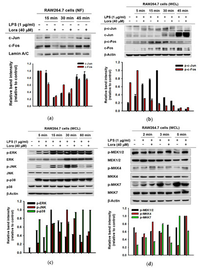 Since we discovered suppressive effects of Loratadine on AP-1-mediated gene expression and promoter activity of AP-1 (Figure 1), we further investigated whether such anti-inflammatory effects could also affect the constituent molecules of the intracellular AP-1 signaling pathway. Based on the concept that two subunits of AP-1, c-Jun, and c-Fos, translocate from the cytosol to the nucleus upon activation [46], the expression levels of c-Jun and c-Fos were determined within the nuclear fraction. In RAW264.7 cells, the nuclear expression levels of both c-Jun and c-Fos were clearly decreased following Loratadine treatment (40 μM) 15 min after LPS induction (Figure 2a). On the other hand, total cell lysate also showed decreased phosphorylation levels of c-Jun at 30 min and c-Fos at 30 and 45 min after LPS treatment (Figure 2b). It clearly indicates that Loratadine inhibits the activity of c-Jun and c-Fos. In addition, decreased levels of total c-Jun and c-Fos by Loratadine imply that Loratadine may also be involved in the degradation of the transcription factors.
