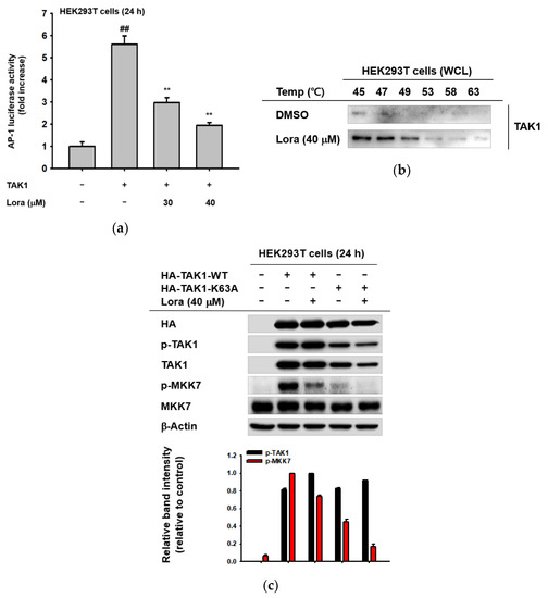 Loratadine specifically targets TAK-1 to exert anti-inflammatory activity. (a) HEK293T cells were transfected with AP-1-luc, HA-TAK-1, and β-galactosidase (control) using PEI for 24 h. Cells were treated with the indicated doses of Loratadine (30–40 μM) for 1 h. The expression level of AP-1 was assessed by measuring luciferase activity. (b) HEK293T cells were transfected with TAK1 using PEI for 24 h and treated with Loratadine (40 μM) for 1 h after transfection. The binding affinity of TAK-1 and Loratadine was evaluated using the cellular thermal shift assay at the indicated temperatures. (c) HEK293T cells were transfected with HA-TAK-1-WT or HA-TAK-1-K63A constructs using PEI for 24 h and treated with Loratadine (40 μM) for 1 h and whole-cell lysates were prepared. The expression levels of total or phosphorylated TAK-1, MKK7, HA, and β-actin (control) were measured through Western blotting analysis. (Bottom panel of c) Relative intensity of these proteins was calculated by ImageJ. ## p < 0.01 compared to the normal group; ** p < 0.01 compared to the control group. Data are presented as mean ± the standard deviation of experiments performed with 4–6 samples. WCL: whole cell lysate.