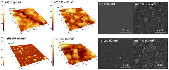 AFM surface images (3D—left) and SEM micrographs (right) of p(NIPAM-BA) layers in water solvent obtained by drop-cast (A,E) and by MAPLE deposition at 250 mJ /cm2 (B,F), 350 mJ /cm2 (C,G), and 450 mJ/cm2 fluences (D,H). AFM images correspond to areas of 5 × 5 µm2 and 2 × 2 µm2. SEM magnifications 40,000×.
