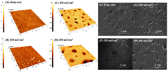 AFM surface images (3D-left) and SEM micrographs (right) on p(NIPAM-BA) coatings when chloroform was used as solvent; (A,E) drop-cast and MAPLE deposition on Si at 250 mJ/cm2 (B,F), 350 mJ /cm2 (C,G), and 450 mJ/cm2 fluences (D,H). The AFM images correspond to areas of 5 × 5 µm2 and 2 × 2 µm2. SEM magnifications 40,000×.