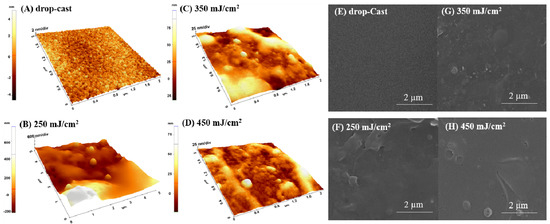 As shown in Figure 1, by both AFM (Figure 1A–D) and SEM micrographs (Figure 1F,G,H), the coatings are characterized by the presence of nano-globular structures on the surface, with their diameter and density increasing with the fluence. For the drop-cast sample, the presence of grains with nano-spherical shapes can also be observed (Figure 1 A). In the case of the coatings deposited by MAPLE, dimensions are from 10 to 200 nm for the samples transferred at the lower laser fluence of 250 mJ/cm2 (Figure 1B,F), while higher laser fluences (350 mJ/cm2 and 450 mJ/cm2) seem to lead/favor the random agglomeration of the globular grains, whose diameter dimensions exceed 500 nanometers (350 mJ/cm2 and 450 mJ/cm2) (Figure 1C,D). Regarding the roughness, measured up to 5 × 5 µm2, it was found that the values increase with the increasing laser fluence, from 36.3 nm for 250 mJ/cm2 to 346 nm for 450 mJ/cm2.