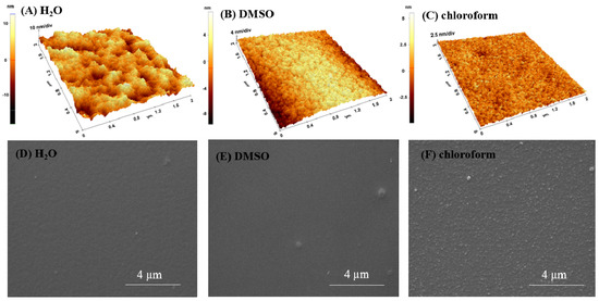 AFM surface images (3D-up) and SEM micrographs (down) on dry layers of p(NIPAM-BA) deposited by spin coating on Si with different rotational parameters (rpm) for each solvent: water, 4500/20 s (A,D); DMSO × 2 steps (5000/1 min 30 s and 6000/50 s) (B,E); chloroform, 4500/10 s (C,F). The AFM images correspond to areas of 5 × 5 µm2 and 2 × 2 µm2. SEM magnifications 20,000×.