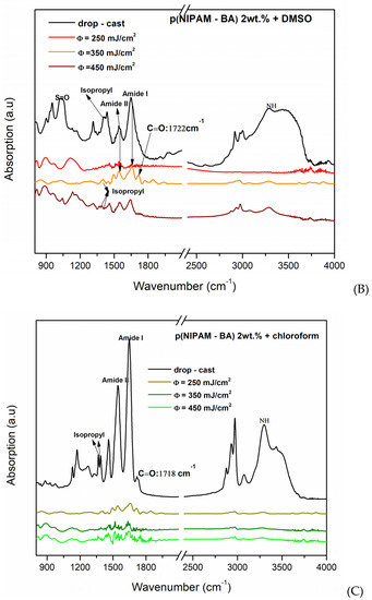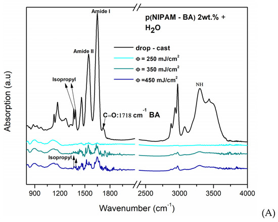 Further investigations show that in the case of the copolymer layers obtained by the MAPLE method using chloroform, the peak corresponding to the BA component is observed at 1718 cm−1, corresponding to C=O (saturated ester) only for the drop-cast coating and at a laser fluence of 250 mJ/cm2, while the peaks observed at 3301 cm−1, 1649 cm−1, and 1543 cm−1 correspond to NH, Amide I, and Amide II (Figure 6C) for all samples while the hydrophilic isopropyl group disappeared. In addition, in the spin coating samples, the characteristic groups appear similar to the MAPLE deposition technique at 3301 cm−1 (NH) (Amide I and II) at 1649–1543 cm−1, and the bands assigned to C-H deformation modes are observable between 1350 and 1450 cm−1, which are characteristic of the symmetric deformation of the isopropyl group for all samples. The BA component corresponding to C=O (saturated ester) appears for the drop-cast and at a laser fluence of 250 mJ/cm2 (water and chloroform).