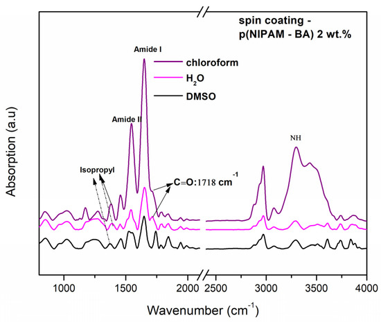 The absorption bands characteristic of the p(NIPAM-BA) copolymer deposited by two different techniques and using three solvents (water, DMSO, chloroform) were analyzed by FTIR analysis. The characteristic vibrations of the functional groups present in the p(NIPAM-BA) layers obtained by spin coating (optimized rotational parameters) and MAPLE (250, 350, 450 mJ/cm2 laser fluences) depositions using the different solvents were subsequently analyzed and compared with the copolymeric control layers (drop-cast, control/Si) (Figure 5 and Figure 6).