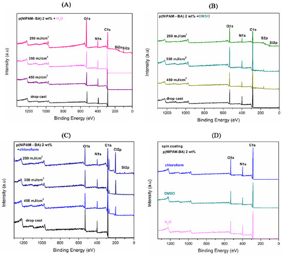 X-Ray photoelectron spectroscopy (XPS) wide survey spectra scan of p(NIPAM-BA) deposited by MAPLE using (A) water, (B) DMSO, and (C) chloroform, compared to drop-cast (black line) at varied laser fluences (250, 350, 450 mJ/cm2) (colored lines) and (D) spin coating at different solvents.