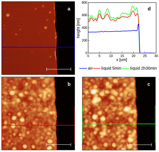 The effects of water on the deposited p(NIPAM-BA) were also studied by imaging the topography of the same area in ambient air and subsequently in water at room temperature. In order to allow the measurement of the layer’s thickness in air and in water, part of the deposited material had been scraped with a cutter blade to create a step. It can be observed that both morphology and thickness are subject to major changes. The thickness values (averaged over the entire scanned areas) are: 347 nm in air; 570 nm in water after a few minutes of immersion; and 611 nm after roughly 2 h and 30 min of immersion. The morphology changes dramatically, with local swelling of the material creating globular-like structures. Some pores remain visible on the surface of the hydrated material despite the thickness increase of more than 150% compared with the initial layer thickness (Figure 8).