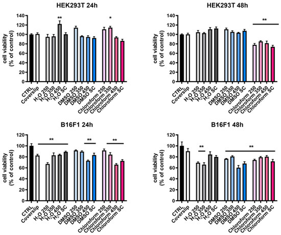 Cell viability was monitored using 0.4% trypan blue dye staining (Invitrogen, Thermo Fischer Scientific, Life Technologies Co, Eugen, OR, USA) and only cells with more than 90% viability were used for biological study. All experiments involving HEK 293T and B16-F1cells were performed in triplicate, twice, n = 6.