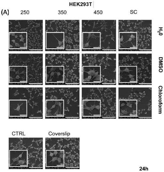 Experiments conducted with both cell lines have shown that viability and proliferation are dependent on the cell line and deposition method of the polymeric coatings. The coverslip supplementary control revealed good proliferation for both the cell lines and time points indicated. The results presented in Figure 9 reveal a minimal impact of different tested biomaterials on normal HEK 293 T cells after 24 h of incubation. However, a significant increase in cell viability for MAPLE with H2O (450 mJ/cm2) (120%, ** p < 0.01 vs. CTRL, glass) and chloroform (110%, * p < 0.05 vs. CTRL) was observed. At 48 h, cells grown on biomaterials doubled the proliferation rate as observed from OD values, which are directly proportional to the number of living cells (Supplementary Figure S2). The calculated cell viability values (%) were similar to the control, the exception being observed for the cells cultured on the layers obtained by MAPLE (all fluences) and SC deposition, using chloroform as solvent. In these cases, a slight decrease in cell number to approximately 80% was observed (** p < 0.01 vs. CTRL). It is worth noting that this level can be considered non-toxic or weak toxic in accordance with ISO legislation [45]. A non-toxic effect on HEK cells and mouse fibroblasts induced by pNIPAM and poly(N-isopropylacrylamide-co-butylacrylate) hydrogels was reported by Capella V et al. [46] and Becerra N et al. [13].
