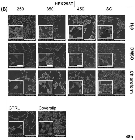 Cell morphology and cells interaction with p(NIPAM-BA) copolymer coatings are important aspects to evaluate to understand the influence of biointerface properties on cell behavior. To observe whether cell morphology and behavior varied as a function of surface properties, HEK 293T and B16F1 cells were examined by scanning electron microscopy after 24 and 48 h of culture in direct contact with the coatings. The results obtained in the cytotoxicity experiment are in agreement with the morphological analysis performed by SEM (Figure 10 and Figure 11).