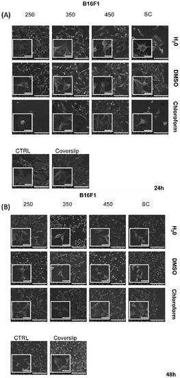 In our study, all the p(NIPAM-BA) coatings showed hydrophilic surfaces, with the lowest hydrophilicity exhibited by the layers obtained by MAPLE and SC deposition procedures and chloroform solvent (Figure 8), where a significant reduction in cell viability was observed, especially at 48 h for both cell lines (Figure 9A,B). Roughness also influences cell behavior; cells such as fibroblasts prefer smooth surfaces, while osteoblasts adhere better on coatings with higher roughness [18,50,51,52,53,54]. In our case, MAPLE layers using DMSO exhibit the lowest roughness compared to H2O and chloroform and together with their hydrophilic character conducted a better survival of normal cells compared to melanoma cells. All these properties support their application as good delivery vehicles for anti-tumoral agents.