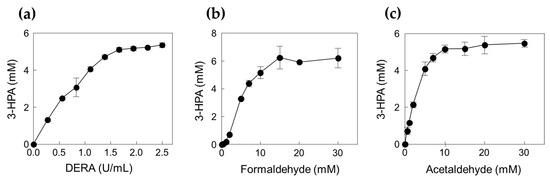 Effects of DERATma enzyme and substrate concentrations for the 3-HPA production. (a) Effect of DERA enzyme concentration. (b) Effect of formaldehyde concentration. (c) Effect of acetaldehyde concentration. The reactions were performed at 20 mM Kpi buffer (pH 7.0), DERATma enzyme, formaldehyde, and acetaldehyde at 40 °C for 120 min. Data represent the means of two separate experiments, and the error bars represent the standard deviation.
