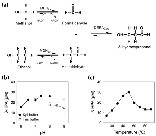 One- or two-carbon (C1 or C2) compounds have been utilized as attractive substrates for biotechnological production of valuable compounds because they are inexpensive and can be used as bio-renewable platform feedstock [1,2]. The production of value-added products from cheap C1 or C2 compounds via chemical processes has been extensively studied [3,4]. However, these chemical processes occur under high temperatures and pressures and release toxic by-products [5]. Recently, enzymatic processes using biocatalysts have been developed to substitute chemical synthesis [6,7,8]. Methanol (C1) and ethanol (C2) are major compounds considered next generation substrates that can be converted to natural metabolite products, such as acetaldehyde, formaldehyde, and acetyl-CoA-derived products, in microorganisms via short biosynthetic pathways. Various biocatalysts, such as alcohol oxidase, oxidoreductase, and methanol dehydrogenase (MDH), have been considered to convert methanol and ethanol [9,10]. Among these enzymes, MDH (EC 1.1.1.244) is a key enzyme for alcohol oxidation, which catalyzes alcohol conversion to aldehyde [11]. Previous studies have reported that MDH from Lysinibacillus xylanilyticus (MDHLx) efficiently converts methanol and ethanol to formaldehyde and acetaldehyde, respectively [12]. Alcohol-derived formaldehyde and acetaldehyde are also renewable feedstock that can be converted to chemical derivatives such as 3-hydroxypropionic acid (3-HP), 3-hydroxypropanal (3-HPA), and 1,3-propanediol (PDO), which are important precursors in the industry [13]. To date, they have been produced from glucose or glycerol using metabolically engineered cells, including those producing glycerol dehydrogenase and aldehyde dehydrogenase enzymes [14,15,16,17,18,19,20,21,22,23,24]. Recently, deoxyribose-5-phosphate aldolase (DERA) from Thermotoga maritima (DERATma, E.C 4.1.2.4) has been introduced as an intermediate enzyme to condense formaldehyde and acetaldehyde to 3-HPA for PDO biosynthesis in engineered Escherichia coli [25]. In this metabolic pathway, aldol condensation between aldehydes is the key reaction point; however, the typical limitations of metabolic engineering include a lack of enzyme engineering or pathway design optimization. In vitro enzymatic reactions have advantages such as enzyme controllability, pathway design, and increasing product titer and yield; however, metabolic engineering in live cells cannot be controlled [26]. Moreover, optimum reaction conditions for 3-HPA production or pathway optimization by applying other enzymes have not been considered yet.