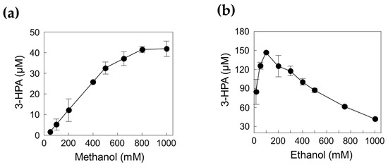 Effect of substrate concentration for 3-HPA production. (a) Effect of methanol. (b) Effect of ethanol. The reactions were performed in 20 mM Kpi buffer (pH 7.4) containing 1.39 U/mL DERATma, 0.026 U/mL MDHLx, 5 mM Mg2+, and 3 mM NAD+ with methanol or ethanol at 45 °C for 120 min. Data represent the means of two separate experiments, and the error bars represent the standard deviation.