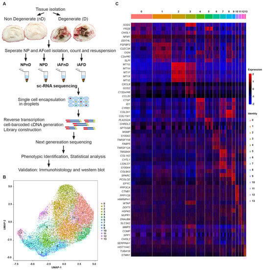 - Fernandes, L.M.; Khan, N.M.; Trochez, C.M.; Duan, M.; Diaz-Hernandez, M.E.; Presciutti, S.M.; Gibson, G.; Drissi, H. Single-cell RNA-seq identifies unique transcriptional landscapes of human nucleus pulposus and annulus fibrosus cells. Sci. Rep. 2020, 10, 15263. [Google Scholar] [CrossRef]