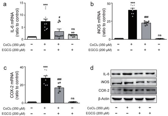 2.2. EGCG Downregulates Expression Levels of Pro-Inflammatory Cytokine and Mediators in CoCl2-Treated BV2 Cells