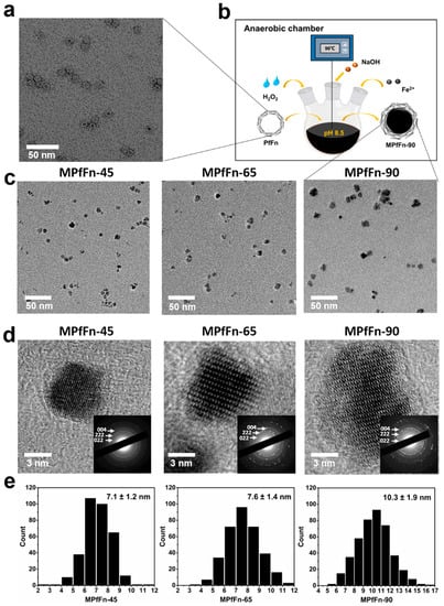 To quantify the real loading factors of iron in the ferritin cage of the MPfFn-45, MPfFn-65, and MPfFn-90, the ferritin cage and iron contents were determined by thermogravimetric analysis (TGA) and the Ferrozine method [], respectively. The ferritin cage and Fe percentages of these particles are listed in Table S1 (see Supplementary Materials). Accordingly, we calculated that the ferritin cages of MPfFn-45, MPfFn-65, and MPfFn-90 contain 5494, 6737, and 9517 Fe atoms, respectively.