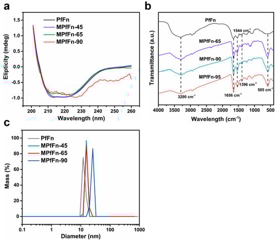 (a) CD spectra of the PfFn and MPfFn samples. (b) FTIR spectra of PfFn and MPfFn samples. (c) DLS analysis of PfFn, MPfFn-45, MPfFn-65, and MPfFn-90 samples with hydrodynamic diameters of 13.8, 15.4, 16.0, and 25.0 nm, respectively.