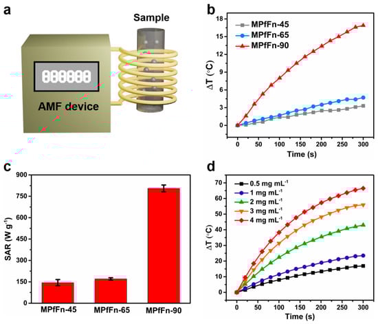 Hyperthermic performance of MPfFn under AMF. (a) Schematic illustration of the magnetic hyperthermia test. (b) Time-dependent temperature change curves of MPfFn-45, MPfFn-65, and MPfFn-90 under an AMF (= 485.7 kHz, H = 49 kA m−1). (c) Comparison of SAR values. (d) Time-dependent temperature change curves with different iron concentrations.