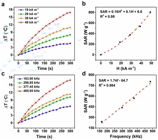 Effects of magnetic field intensities (H) and AC frequencies (f) on the hyperthermia performance of MPfFn-90. Time-dependent temperature change curves with varying (a) H and (c) f. SAR values as a function of (b) H and (d) f.