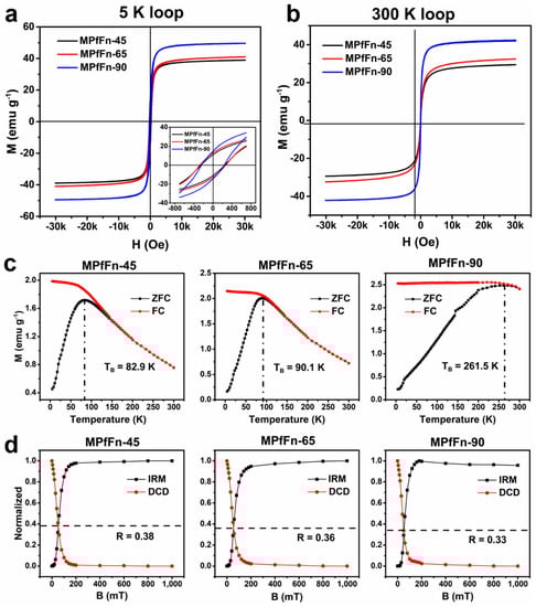 Magnetic characterization of MPfFn nanoparticles. Hysteresis loops of the MPfFn samples measured at (a) 5 K and (b) 300 K. (c) ZFC/FC magnetization curves of the three samples. (d) Normalized IRM acquisition and DCD curves of the three samples.
