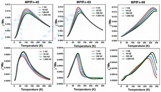 AC susceptibility of MPfFn samples performed with various logarithmic spaced frequencies in the 1–1000 Hz range. The upper and lower figures are the in-phase (χ′) and out-of-phase (χ″) susceptibility, respectively.