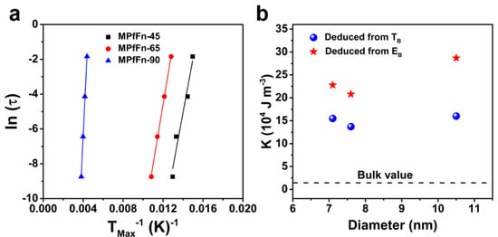 (a) Linear plot of the inverse of maximum temperature (1/TMax) of each frequency according to the Arrhenius law. (b) Effective magnetic anisotropy values (Keff) of MPfFn-45 (7.1 nm), MPfFn-65 (7.6 nm), and MPfFn-90 (10.5 nm) obtained from EB (red stars) and TB (blue dots). The black dotted line represents the bulk value of EB.