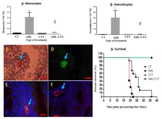 The survival of the AML- and CYT-treated immature mice was examined for 6 weeks post treatment. Our results show that AML-injected immature mice survived around three weeks post injection, whereas the AML+CYT-injected immature group survived for 36 days post injection (Figure 1G). The CT group and the CYT (alone)-injected group survived for the duration of the experiment (Figure 1G).