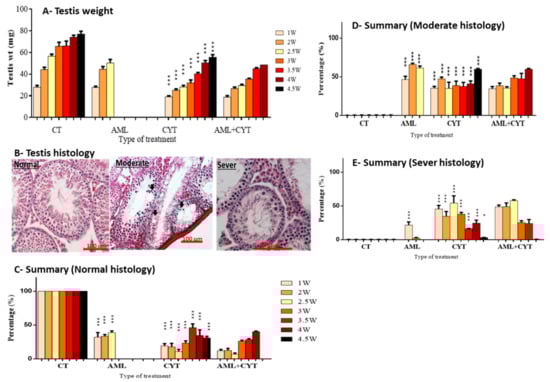 Our results showed a significant decrease in the percentages of normal histology of the seminiferous tubules (STs) at all examined time points post treatment in the AML- (1–2.5 weeks), CYT- (1–4.5 weeks) and AML+CYT (1–4 weeks)-treated groups compared to control (Figure 2C). Additionally, we observed a significant increase in the percentages of moderate and severe histology of STs at all examined time points post treatment in the AML- (1–2.5 weeks), CYT- (1–4.5 weeks) and AML+CYT (1–4 weeks)-treated groups compared to control (Figure 2D,E). Testicular histology from testes of the AML+CYT-treated group showed similar percentages of damage of the seminiferous tubules as those of the CYT-treated group, with no additive/synergistic effect at any of the examined time points (1–4.5 weeks) (Figure 2D,E).