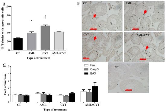 These results may suggest that AML and CYT treatments increase the percentage of tubules with positive apoptotic stained cells. It is known that CYT has the ability, like other cytotoxic medications, to induce damage in the proliferating cells, which leads to an increase in the percentage of apoptotic cells.