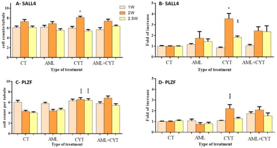 Following the examination of the effect of AML and CYT on the apoptosis process in testes, we investigated the effect of those treatments on cells of the seminiferous tubules at different stages of spermatogenesis, such as SALL4 and PLZF (premeiotic stage), CREM (meiotic) and acrosin (meiotic/post-meiotic). Following immunohistochemical staining (IHC) for SALL4 (see Figure S1A) and PLZF (see Figure S1B), we counted the number of positively stained cells/tubule and summarized the results. In addition, we examined the effect of AML and CYT on the expression levels of SALL4 and PLZF in the testes of the treated mice. The data show that AML and AML+CYT treatments did not significantly affect the number of SALL4-stained cells/tubule, PLZF-stained cells/tubule or their expression levels at any of the examined time points compared to the control (Figure 4A–D). However, CYT treatment significantly increased the number of SALL4-stained cells/tubule 2 weeks post treatment and the expression levels 2 and 2.5 weeks post treatment compared to the control group (Figure 4A). It should be noted that the expression of SALL4 2.5 weeks post treatment was lower than at 2 weeks post treatment (Figure 4B). On the other hand, CYT treatment significantly increased the number of PLZF-stained cells/tubule 2 and 2.5weeks post treatment and the expression levels 2 weeks post treatment compared to the control group (Figure 4C,D).